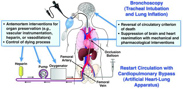 Schematic of the procedure used in Donation after Cardiac Death (DCD): the procedure used precisely maps that developed by cryonicists decades ago to support post-pronouncement viability in cryopatients, with the notable exception that the brain is actively excluded from such support in DCD. [1]
