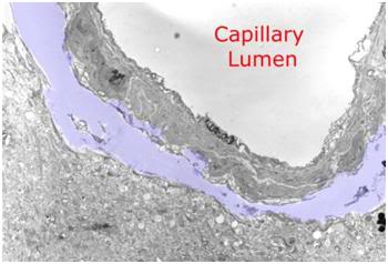 Figure 11: Peri-capillary tear in the parenchyma of the cerebral cortex as a result of hyperosmotic dehydration secondary to cryoprotective perfusion prior to vitrification. The space resulting from the dissection of the neuropil from the capillary basement membrane has been colored with a light purple tint.