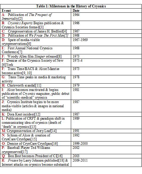 In the course of trying to understand the Google Ngram plot for cryonics, I was struck by two features that seemed in want of explanation; a drop, followed by plateau in its usage in the period from ~ 1980 to ~ 1990, and a sharp decline in the frequency of its usage starting at around 2003 and continuing through to 2005, and perhaps beyond. These are two obvious discontinuities that commanded attention, and demanded explanation, even with a cursory inspection of the data. My subsequent course of action was to generate a subjective/objective time line of what I considered to be important historical events in cryonics (see Table 1, above). The importance of some of these events would be difficult to contest, such as the publication of Ettinger’s The Prospect of Immortality in 1964, Dr. James H. Bedford’s cryopreservation in 1967, the Chatsworth debacle in 1979 wherein the loss of the 9 Cryonics Society of California (CSC) patients at Oakwood Memorial Park Cemetery in Chatsworth, California became a highly visible public scandal in 1979, the Dora Kent incident in 1987, and the cryopreservation of Ted Williams in 2002. These events, for good or ill, attracted enormous media attention, and also resulted in books that either mentioned these issues, or used them as background themes, or plot mechanisms in stories and novels.