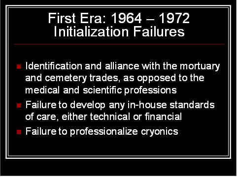 In short, there was a failure to take personal responsibility for the success or failure of implementing cryonics and a near total failure to understand the enormous negative impact of missteps, or outright failure, on the credibility and viability of the idea.