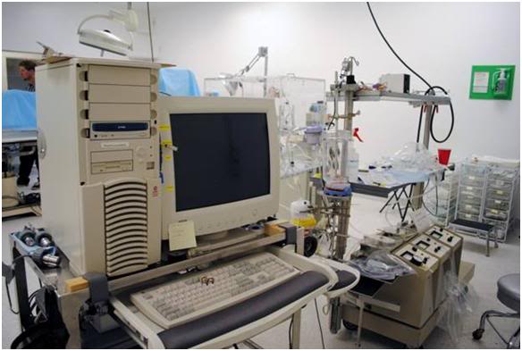 Figure 6: Alcor operating room perfusion and data acquisition equipment. The refractometer heads used to continuously acquire cryoprotectant agent concentration to the left of the computer. Photo by Stanislaw Lipin; courtesy of KrioRus.