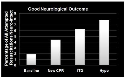 These interventions, remarkable achievements that they are, do not escape from the harsh reality that the 400% increase in survival from cardiac arrest in Wake County, when expressed in absolute terms, means that the number of lives saved increased from ~5 to 25 – out of 395 SCA patients; a huge relative gain, but a comparatively small increase in the absolute number and percentage of lives saved, and minds salvaged. The true life saving potential of MTH remains elusive by virtue of its exceedingly small therapeutic window.
