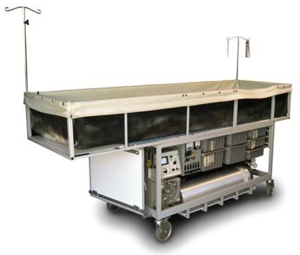 Figure 13: The Life Recovery Systems ThermoSuit™ employs direct ice water contact with the patient’s skin to achieve the maximum possible rate of cooling by external means. The system consists of an inflatable insulating and water containment patient enclosure inside of which the patient rests on a mat of Dacron bonded polyester ‘wool’ which acts to diffuse and film water pumped over the dorsal surface of the patient’s body. Water at 2-4oC is thin-filmed over the ventral surface of the body by a thin, transparent blanket with many hundreds of small perforations through which water under pressure pours out and over the patient. Cold water is recirculated over crushed or cubed ice in an insulated reservoir containing a disposable liner and pumps. Cooling is computer controlled via a thermistor which can be placed in any desired anatomical location. All patient contact items are single-use and disposable (including, as previously mentioned, the pumps) http://www.life-recovery.com/.