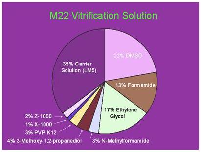 To achieve NVT, Alcor-B is using technology similar to that developed by 21st Century Medicine (21CM), a cryobiological research and development company located in Fontana, CA. We have used M-22 solution, a vitrification solution developed by 21CM primarily for kidney vitrification. The composition of M-22 is shown Figure 8, below. This complex mixture of antifreeze and actively ice-growth inhibiting (ice-blocking) cryoprotectants exhibits comparatively low toxicity, even at concentrations of ~60%. A unique feature of M-22 is the presence of two synthetic molecules that inhibit ice growth by binding to both the a and c axes of ice. These molecules stabilize the solution against ice nucleation and propagation, allowing for use of the much slower cooling and rewarming rates needed for ice free cryopreservation of large tissues masses, such as humans organs or entire human beings.