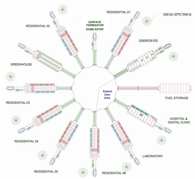 Figure 10: The subterranean complex that comprises the maximally hardened parts of the Alcor-B Mobile, AZ Facility. The ECD-60 Dome serves as the hub from which 11 modules radiate like spokes. There are 6 residential modules, a hospital/dental module, a laboratory module which houses an emergency cryopreservation capability, a diesel fuel storage tank, a diesel powered electricity generating plant and a greenhouse which is used for storage of supplies until the facility becomes active in an emergency. The Patient Care Area is the in part of the ECD-60 that adjoins the clinical and technical spokes of the facility. The remainder of the ECD-60 houses the communications and defense center and is used for storage, communal dining and meeting spaces.