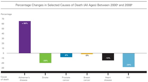 Figure 4: The large increase in Alzheimer’s Disease as a cause of death in the United States is largely a function of the increasing average age of the population and the survival of many additional individuals into advanced old age. Source: http://www.alz.org/downloads/Facts_Figures_2012.pdf