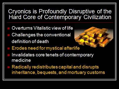 So, if we look at cryonics objectively and in the context of this culture and this civilization at this time, then cryonics is just about the most disruptive and threatening idea that has ever come along. Unlike Natural Selection or Germ Theory, or even Heliocentrism, cryonics will inevitably overturn the Vitalistic view of life, challenge the conventional definition of death, erode the need for a mystical afterlife, invalidate the core tenets of contemporary medicine, and radically redistribute capital and disrupt inheritance, bequests, and mortuary customs!